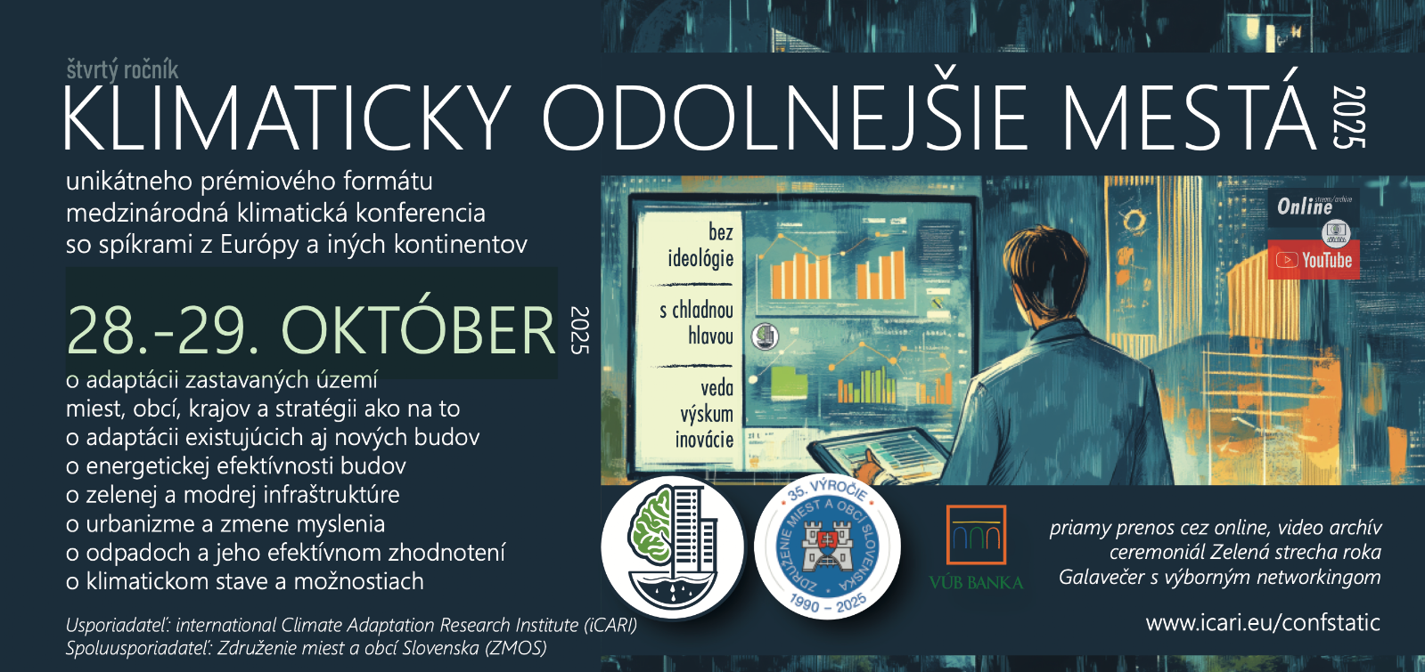 V dňoch 28. - 29. októbra 2025 sa v Hoteli SAFFRON ****, v Bratislave, bude konať medzinárodná konferencia zameraná na klimatickú adaptáciu miest, obcí a zastavaného územia, pripravovaná v úzkej spolupráci so Združením miest a obcí Slovenska (ZMOS).