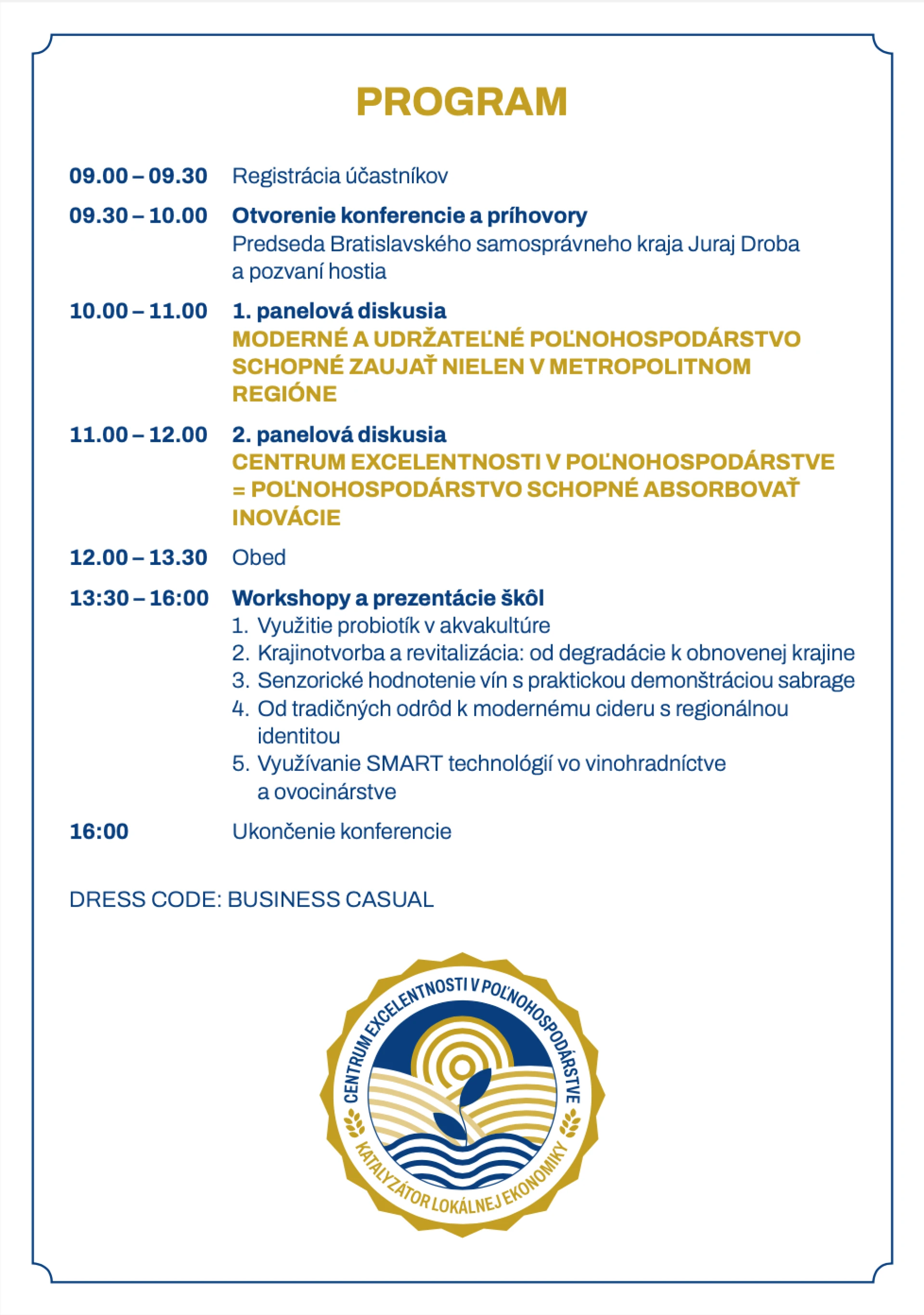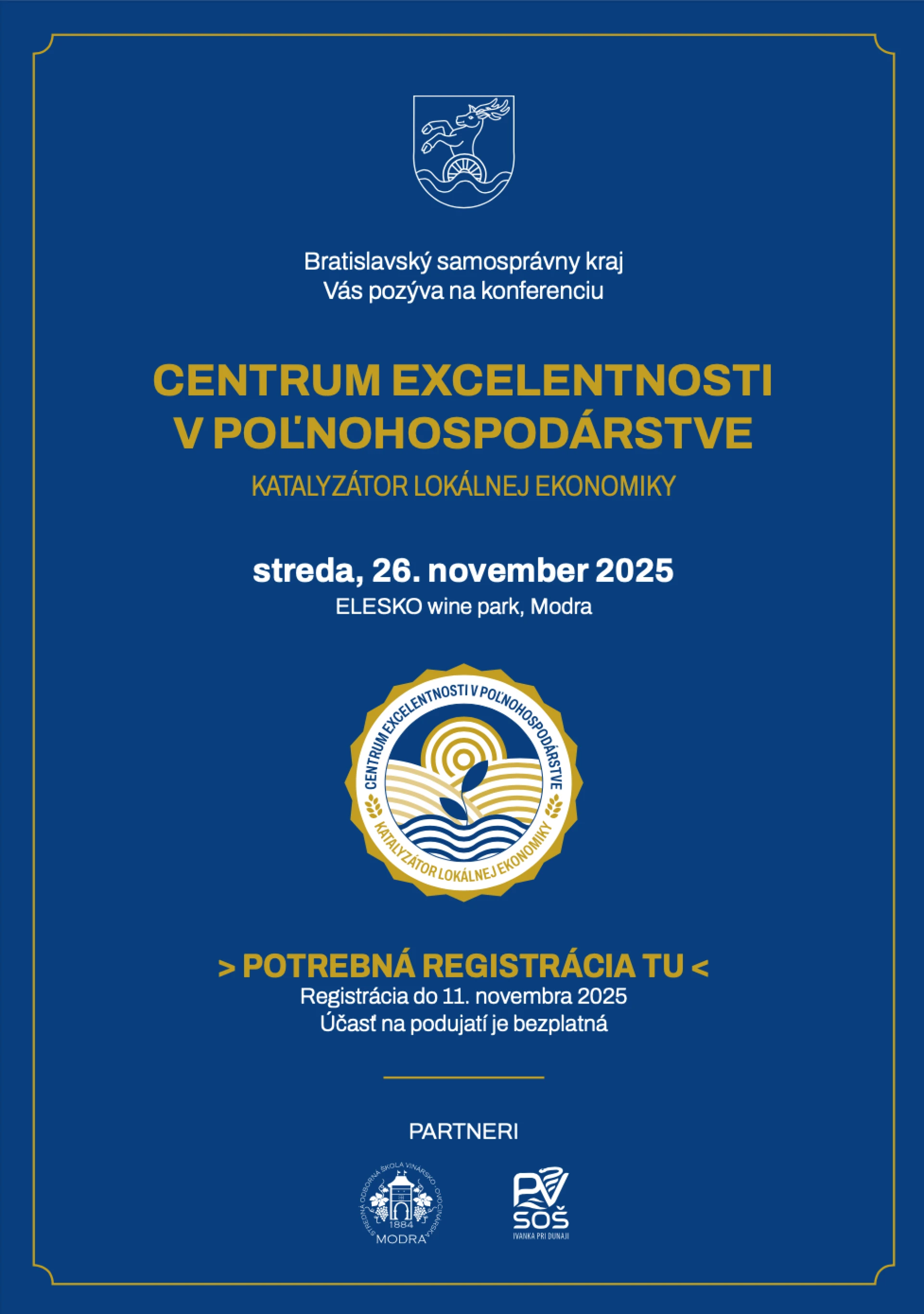 V stredu 26. novembra 2025 sa uskutoční odborná konferencia, ktorá predstaví Centrum excelentnosti v poľnohospodárstve, čiže nové inovatívne centrum na podporu vzdelávania. Organizátorom je Bratislavský samosprávny kraj (BSK).