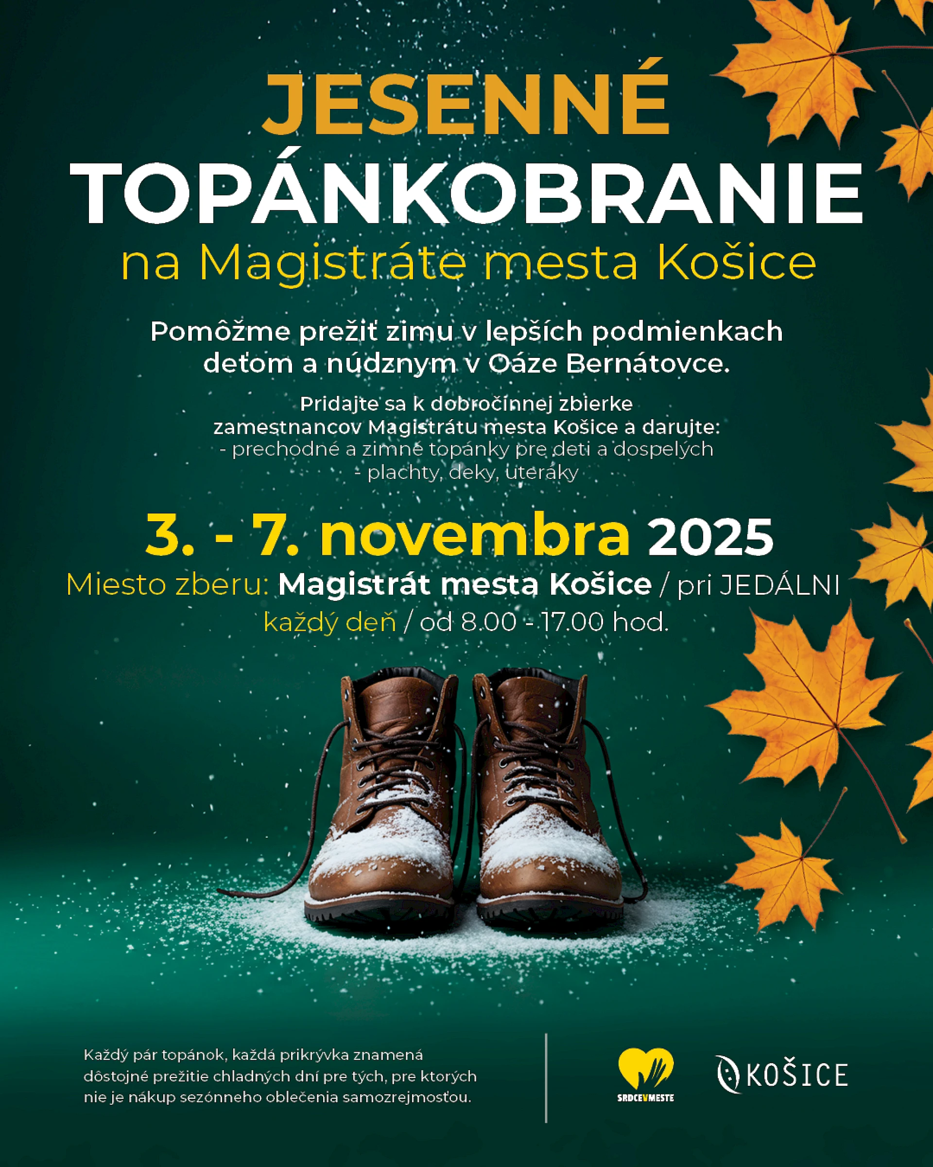 Mesto Košice vyhlásilo dobročinnú zbierku Jesenné Topánkobranie pre charitatívne organizácie, ktoré pomáhajú ľuďom bez domova a rodinám v ťažkej životnej situácii.