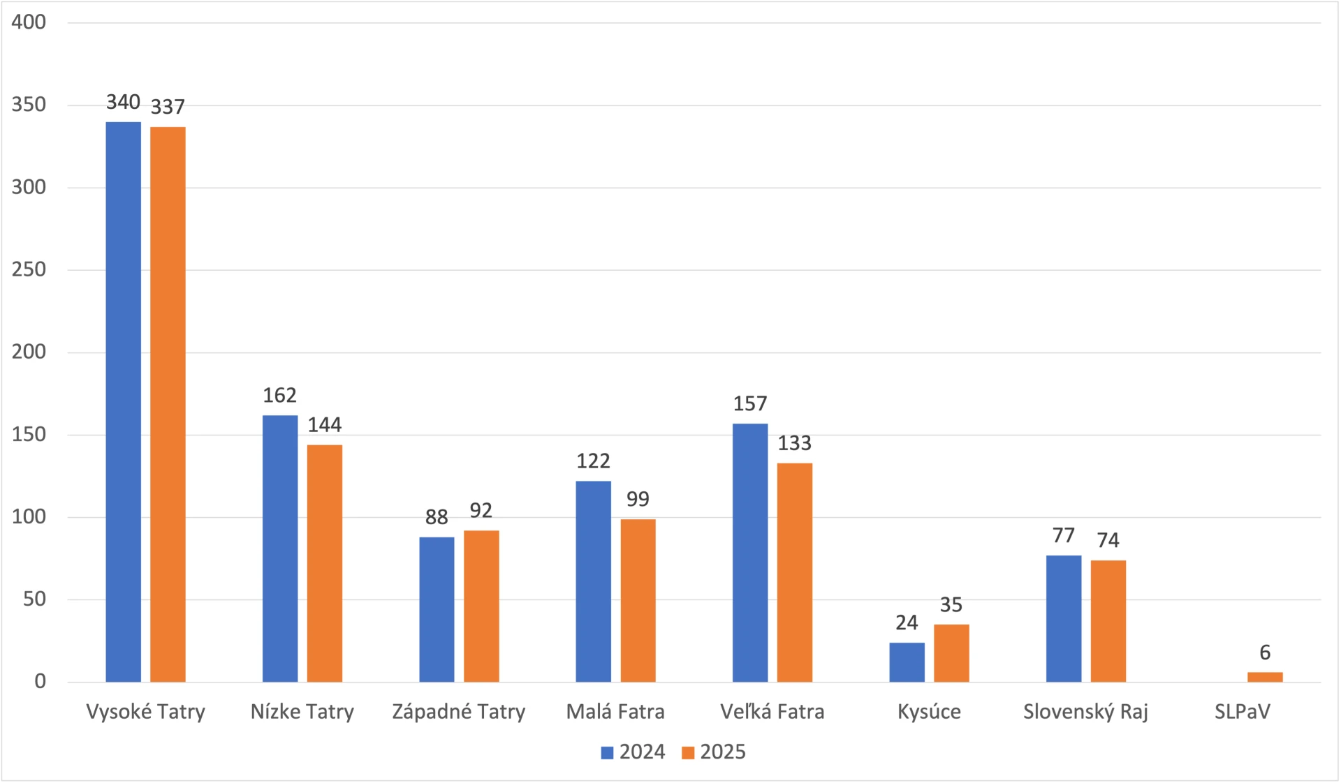 oblastiach 970-krát, prevažne na turisticky značených chodníkoch (TZCH), v roku 2025 bolo záchranných akcií 920, čo je pokles o 5,2 %. Najčastejšie zasahovali záchranári HZS z Vysokých Tatier - spolu 337-krát. V Nízkych Tatrách prebehlo spolu 144 zásahov a Veľká Fatra ukončila rok s číslom 133 zásahov.