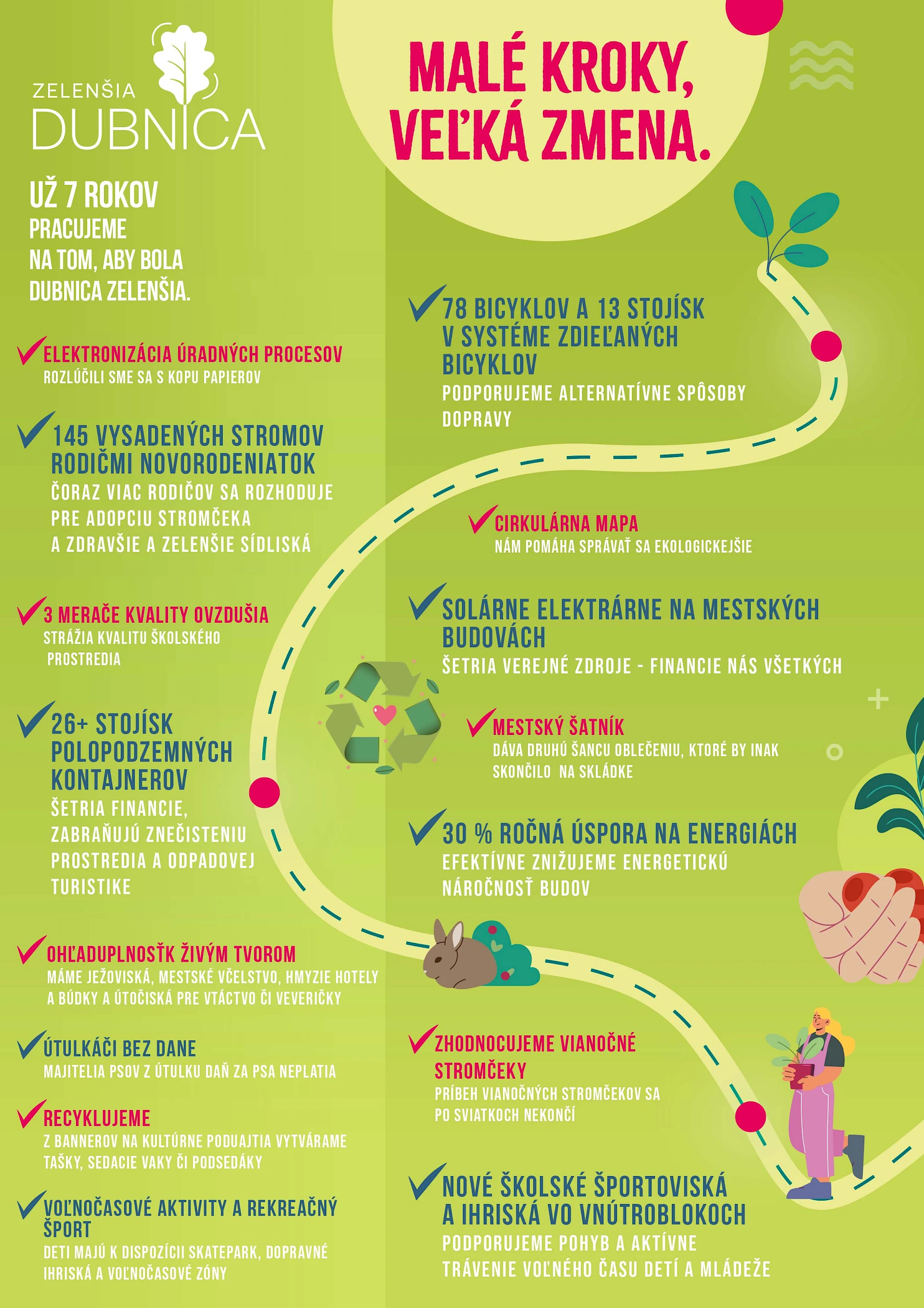 Po 7-ročnom úsilí spraviť Dubnicu nad Váhom zelenšou, udržateľnejšou a flexibilne reagujúcou na aktuálne klimatické výzvy sa mesto obracia aj priamo na obyvateľov. „Chceme požiadať aj obyvateľov a obyvateľky, aby sa k nám pridali a pomohli nám lepšie sa adaptovať na meniace sa klimatické podmienky. Za tých sedem rokov sme ako samospráva prešli naozaj dlhú cestu a urobili viacero zásadných opatrení. Vo vozovom parku máme 4 elektrické a hybridné vozidlá, veľmi dobre sa darí našej kampani Zasaď si svoj strom – s rodičmi novorodencov sme vysadili už stovky stromov, využívame fotovoltické elektrárne a medziročne šetríme vďaka znižovaniu energetickej náročnosti budov 30 % nákladov na energie. Projekt Zelenšia Dubnica je vyústením tejto snahy a zároveň má byť výzvou aj pre obyvateľstvo,“ dodal k téme primátor mesta s tým, že jedným z cieľov projektu je aj zvýšenie miery vytriedenosti komunálneho odpadu nad 60 %.