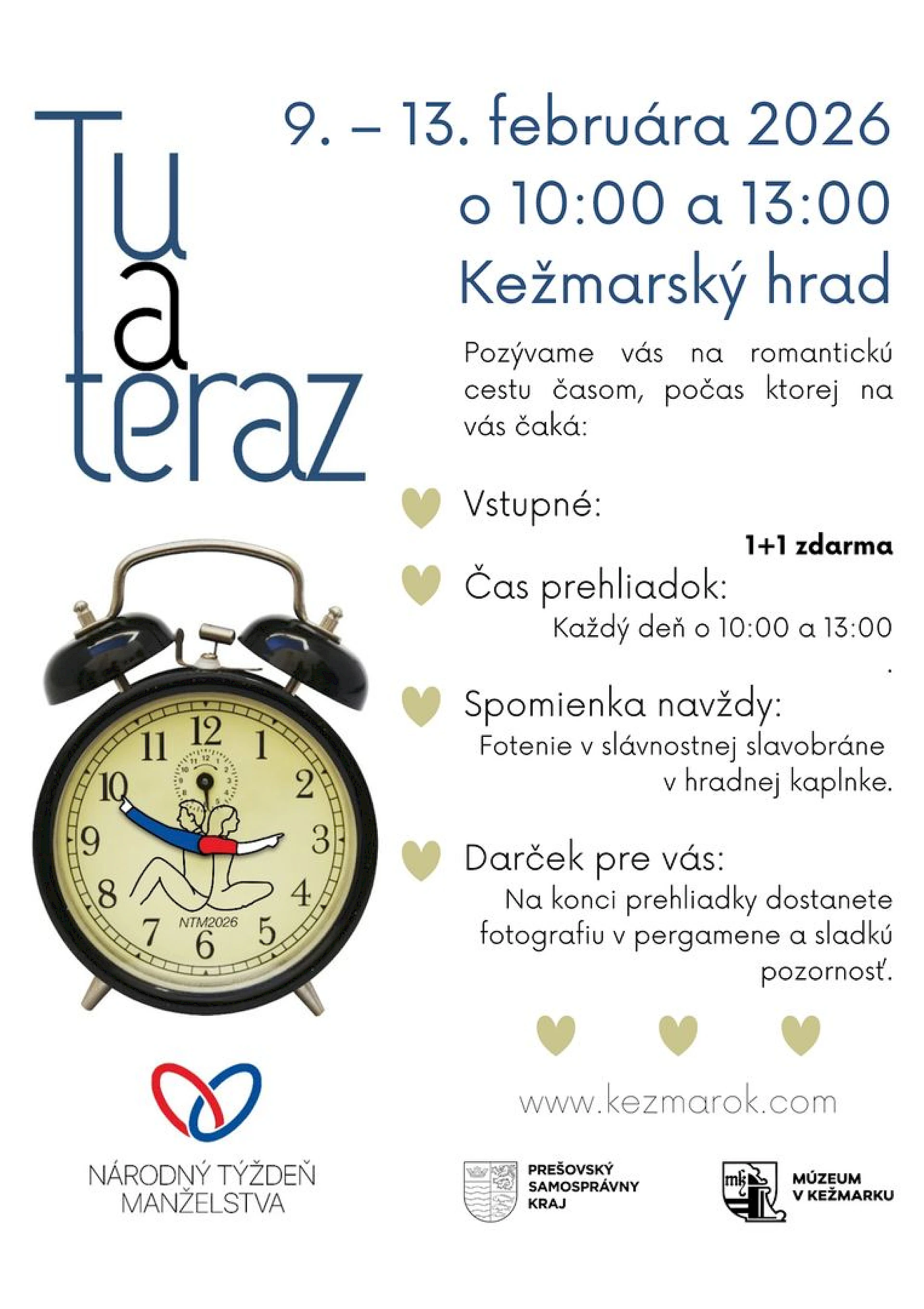 Do iniciatívy Národného týždňa manželstva sa aj tento rok zapájajú kultúrne organizácie Prešovského samosprávneho kraja. Vo valentínskom týždni od 9. do 15. februára ponúknu svojím návštevníkom rôzne zľavy a výnimočné podujatia s podtitulom tohtoročnej témy „Tu a teraz“.
