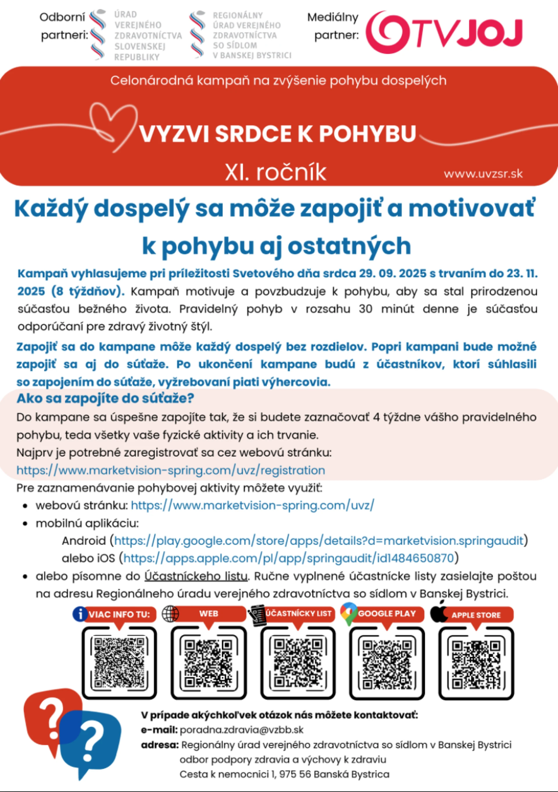 Úrad verejného zdravotníctva SR spolu s Regionálnym úradom verejného zdravotníctva v Banskej Bystrici vyhlásili pri príležitosti Svetového dňa srdca (29. 09. 2025) XI. ročník celoslovenskej kampane „VYZVI SRDCE K POHYBU“ s trvaním do 23. 11. 2025 (8 týždňov). Mediálnym partnerom kampane „Vyzvi srdce k pohybu“ je TV JOJ.