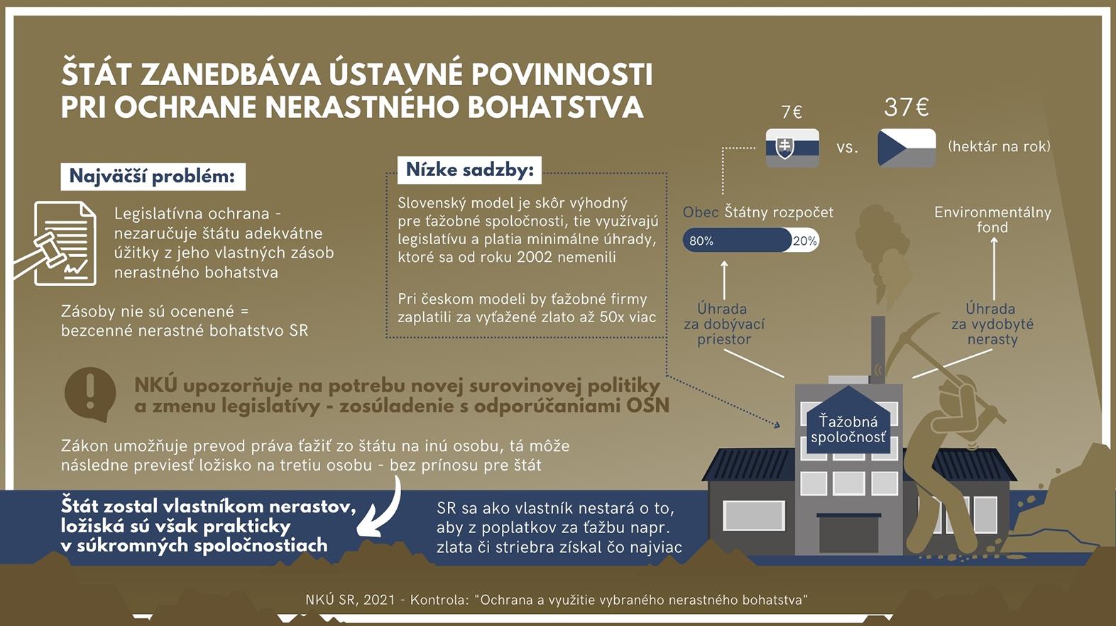 Slovenská republika, ako jeho vlastník, sa nestará o to, aby z poplatkov za ťažbu, napríklad zlata či striebra, získala čo najviac. Súčasný model na Slovensku je výhodný najmä pre ťažobné spoločnosti, ktoré využívajú nejednoznačnosť legislatívy a tak platia štátu minimálne úhrady. Ak by sa uplatňoval český model výpočtu poplatkov, ťažobné firmy by zaplatili napríklad za ťažbu zlata až päťdesiatnásobne viac. Najvyšší kontrolný úrad SR (NKÚ) na základe výsledkov kontroly upozorňuje poslancov Národnej rady SR na potrebu zmeniť legislatívu tak, aby nerastné bohatstvo, podzemné vody a prírodné liečivé pramene boli účinne chránené nielen pre súčasné, ale hlavne budúce generácie. Podľa NKÚ súčasný právny model zodpovedá vnímaniu hodnoty nerastného bohatstva ešte v mantineloch minulého storočia. Vzácne kovy, liečivé pramene a podzemné vody sú jedným z najcennejších bohatstiev celej slovenskej spoločnosti. Práve preto národná autorita pre externú kontrolu nabáda parlament k zmene legislatívy. Súčasný stav vyhovuje len veľmi úzkej skupine vyvolených a tomu musí zabrániť.