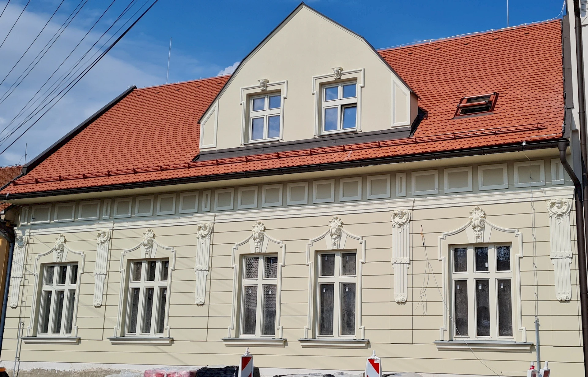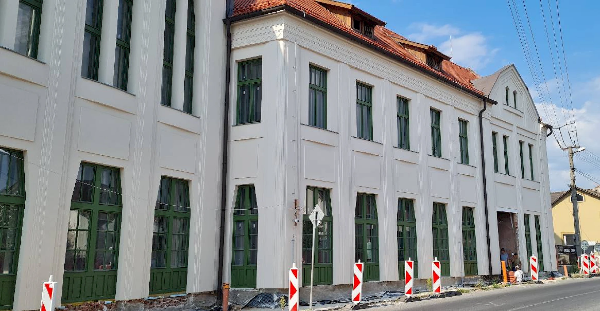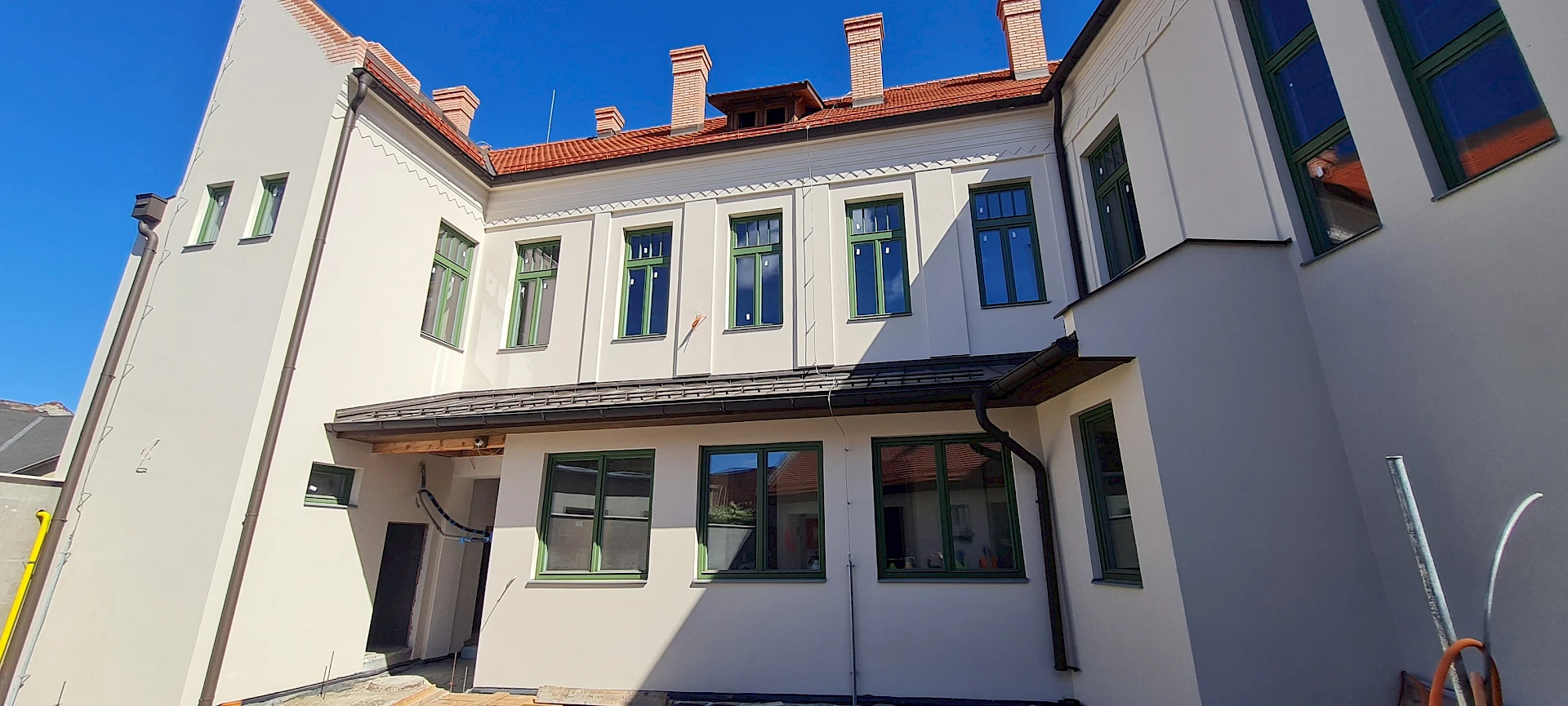 „Rekonštrukcia sa skladá z dvoch častí – z Plánu obnovy riešime vonkajšiu obnovu a energetickú úspornosť budovy. Týka sa to najmä centrálneho vykurovania, výmeny okien, strechy, rekuperácie vzduchu a podobne,“ priblížil primátor Attila Agócs s tým, že na tento účel dostala samospráva dotáciu 2,5 milióna eur. Exteriérová časť rekonštrukcie budovy sa v týchto dňoch chýli ku koncu. „Fasáda je skoro dokončená, chýbajú ešte kamenné sokle, ktoré vyrobí subdodávateľ z Prahy.“ Pri obnove fasády sa snažili zachovať čo najviac historických prvkov a podľa starých fotografií zrekonštruovali aj tie zaniknuté. „Naozaj krásne sa urobili staré šambrány a fasádne ozdoby. Navrátili sme starý tvar okien, aj ich pôvodnú zelenú farbu. Krásny prvok je i záchrana niekdajšej drevenej pozorovateľne hasičov.“