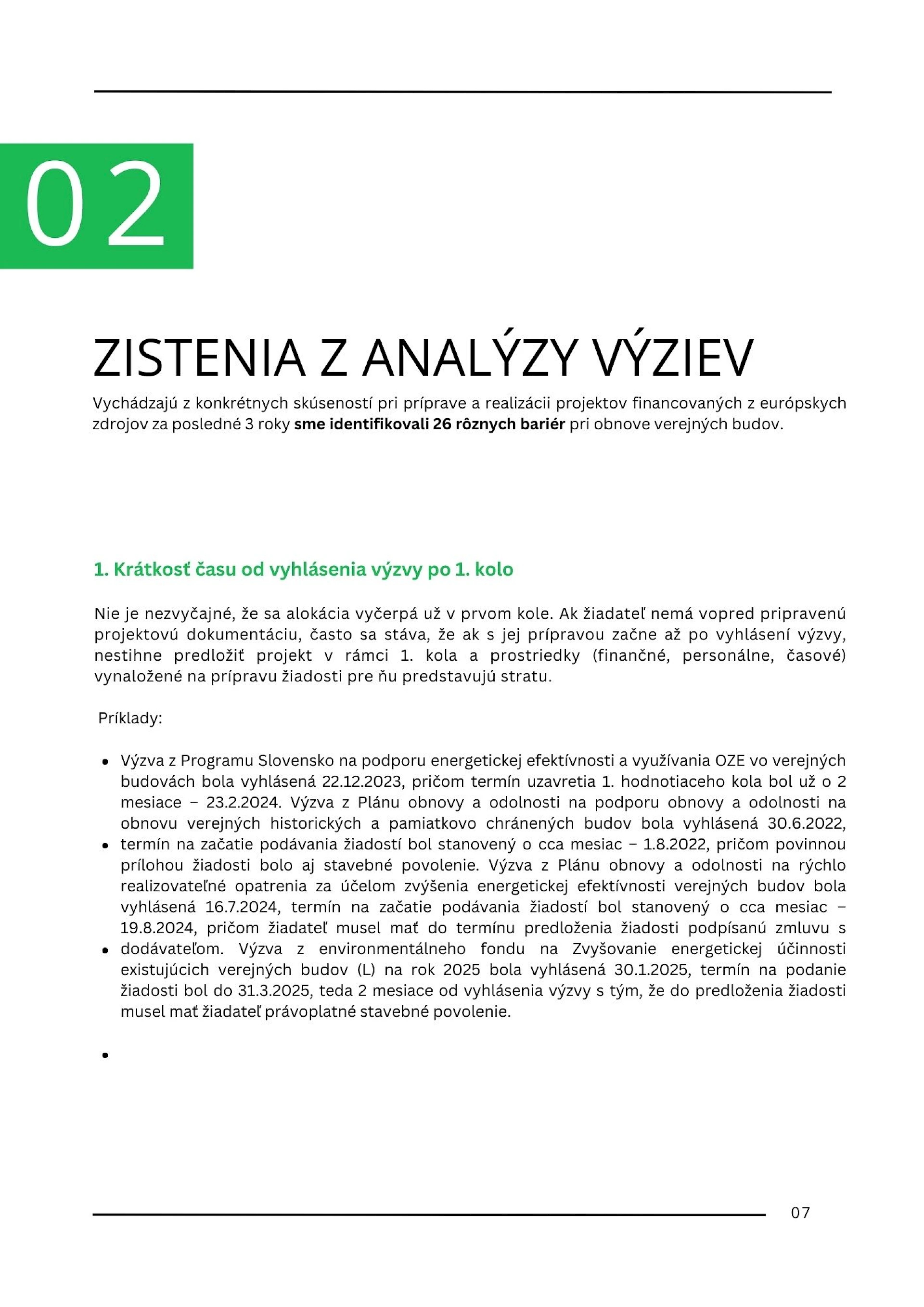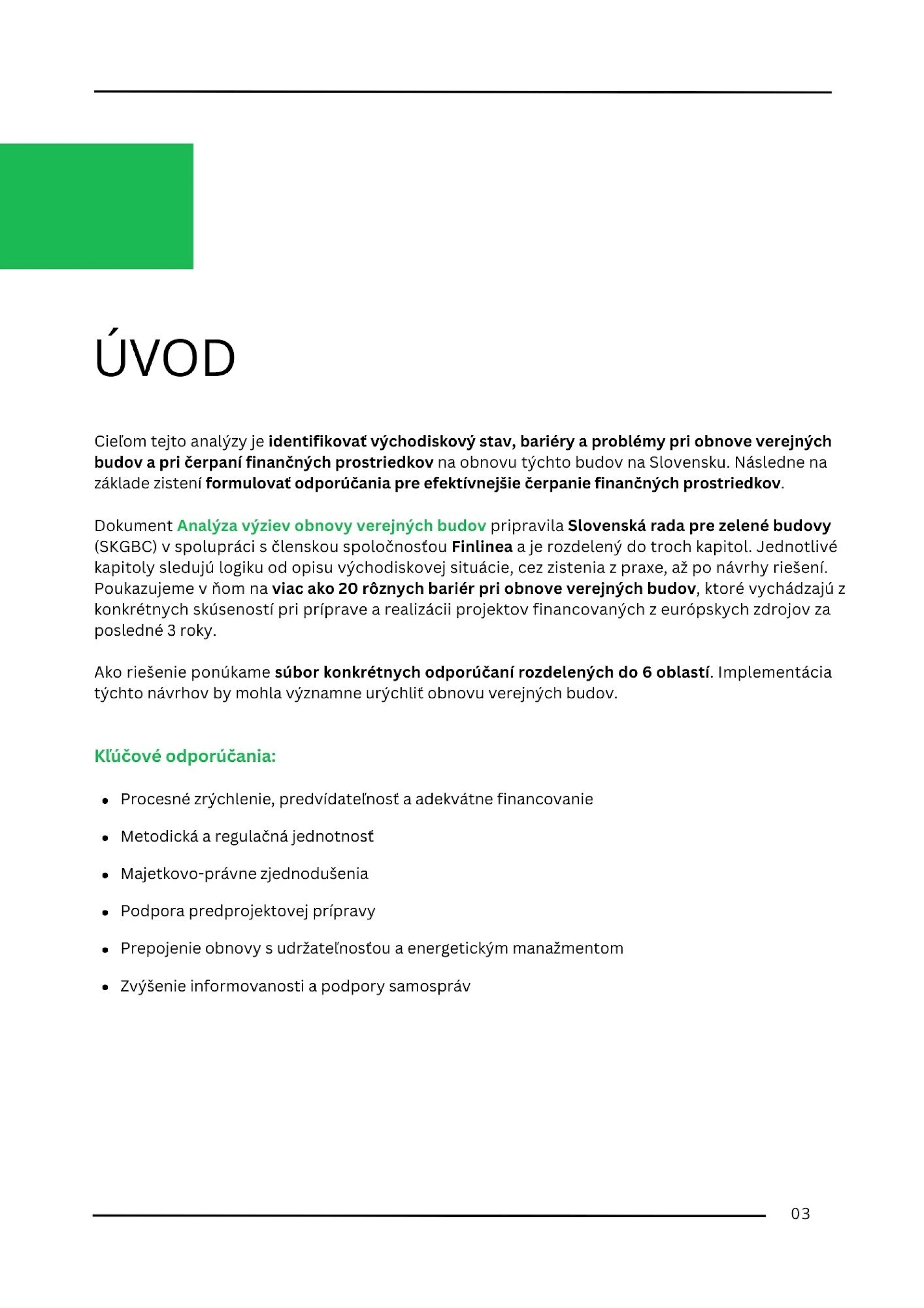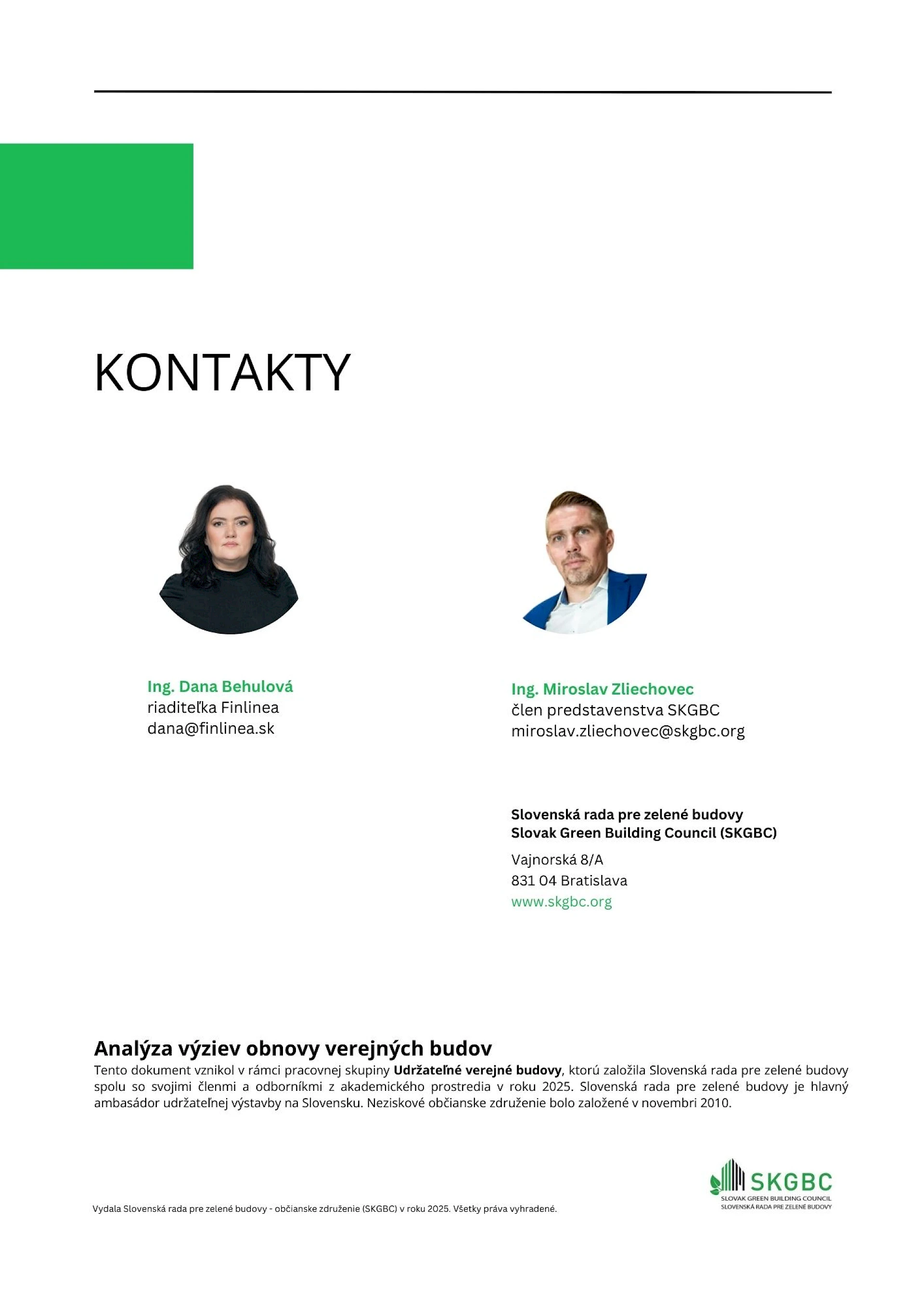SKGBC pripravila v spolupráci so spoločnosťou Finlinea podrobnú Analýzu výziev obnovy verejných budov a navrhla konkrétne riešenia na zlepšenie obnovy verejných budov na Slovensku. Analýza nadväzuje na Prieskum o pripravenosti samospráv na obnovu verejných budov, do ktorej sa zapojilo viac ako 850 miest a obcí. Vychádzajúc zo skúseností pri príprave a realizácii projektov financovaných z európskych zdrojov za posledné 3 roky identifikovali pri obnove verejných budov viac ako 20 rôznych bariér a navrhli aj konkrétne odporúčania.