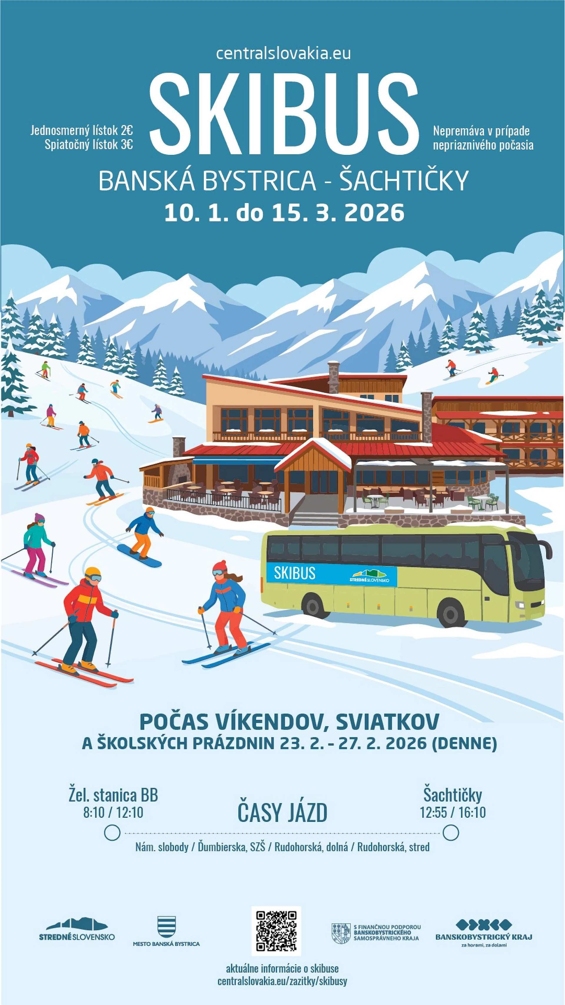 Skibus z Banskej Bystrice premáva do prímestského strediska Šachtičky v termíne od 10. januára do 15. marca 2026 počas víkendov, sviatkov a jarných prázdnin (23.2. – 27.2.2026). Len približne 30 minúť jazdy delí lyžiarov, rodiny s deťmi aj bežkárov od zimných radovánok v príjemnom horskom prostredí. Kapacita skibusu je 50 osôb. Skibusy štartujú zo železničnej stanice Banská Bystrica o 8:10 a 12:10. Preprava psov je možná v prípade, že má pes náhubok a je na vodítku.