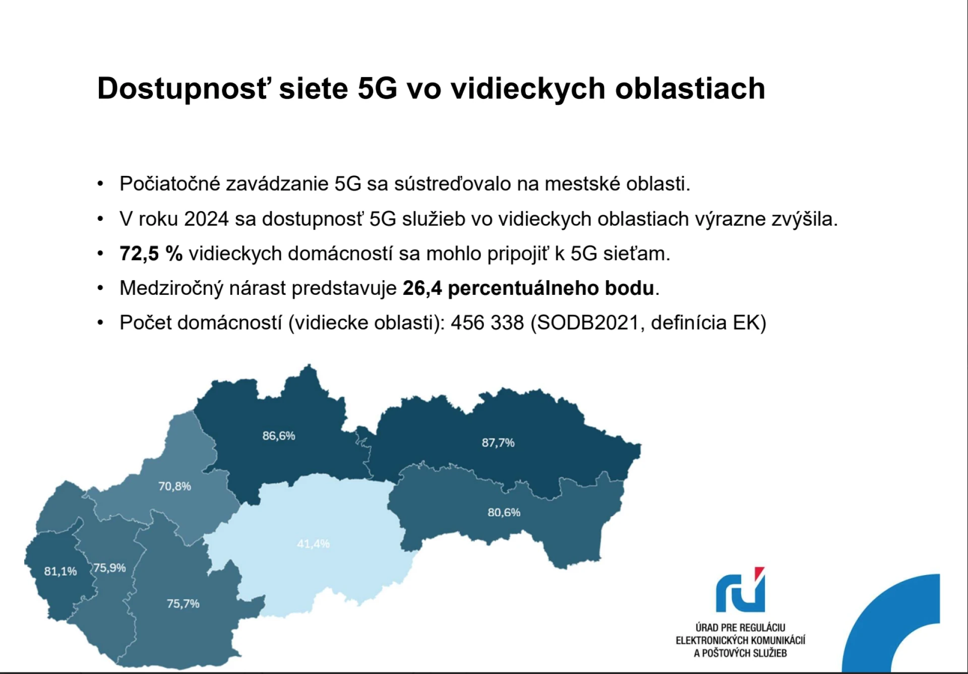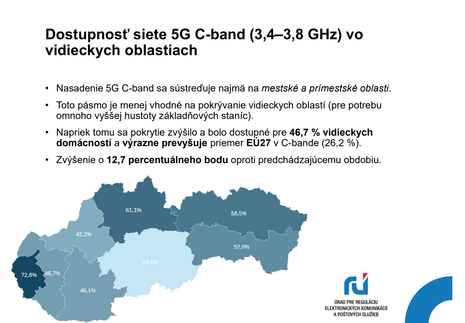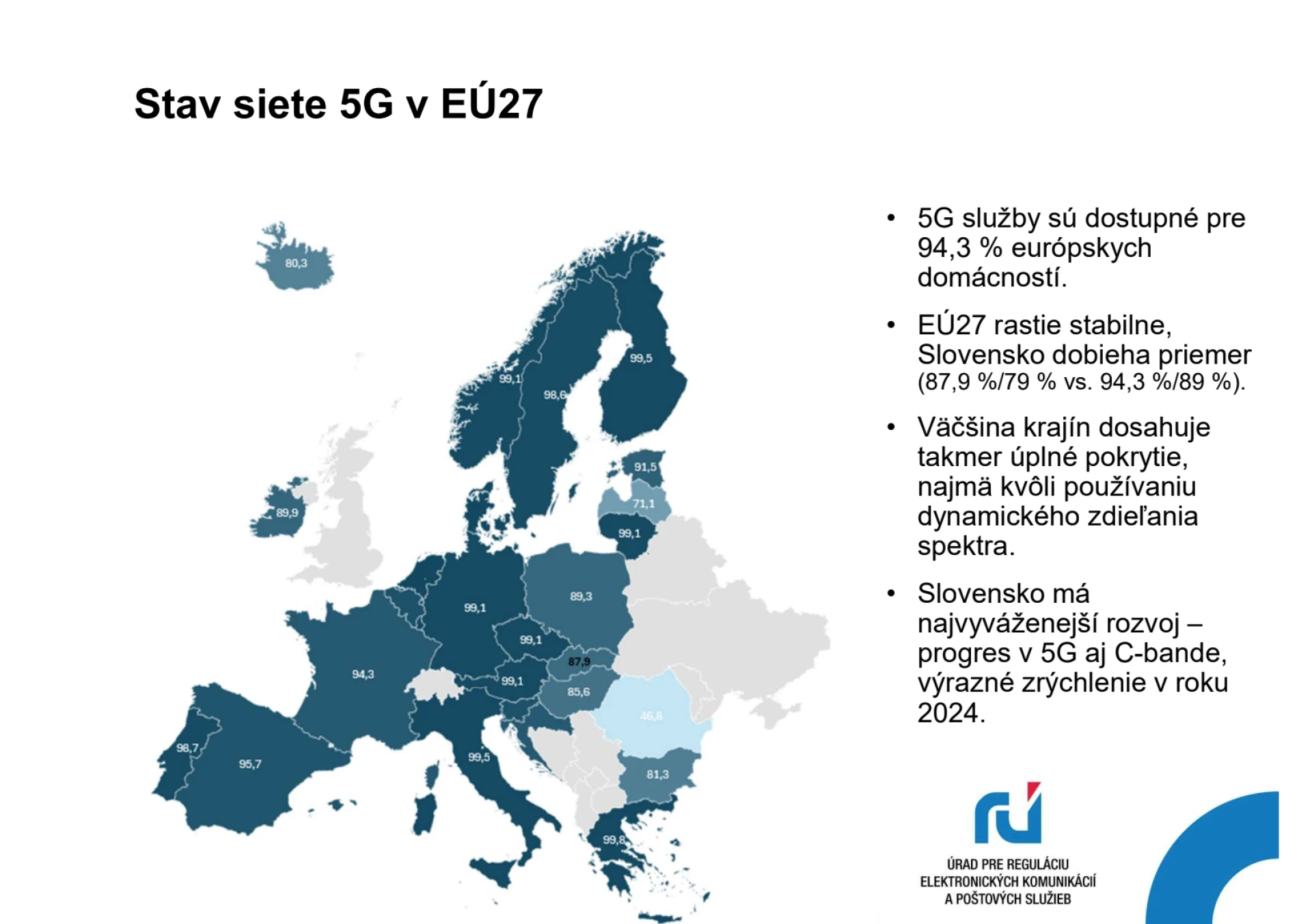 Medzinárodné porovnania Európskej komisie (DESI) potvrdzujú, že Slovensko patrí v oblasti „skutočného 5G“ medzi európsku špičku a výrazne prekonáva priemer EÚ. Tento úspech je o to cennejší, že operátori ho dosahujú napriek vysokej ekonomickej náročnosti budovania sietí v tomto pásme. Ich investície smerujú čoraz viac do vidieckych oblastí, kde často absentuje kvalitná fixná infraštruktúra. Túto finančne náročnú expanziu navyše realizujú primárne z vlastných zdrojov. Výsledkom je, že v pokrývaní riedko osídlených oblastí kvalitnou 5G sieťou patrí Slovensku siedme najlepšie miesto v celej Európskej únii.