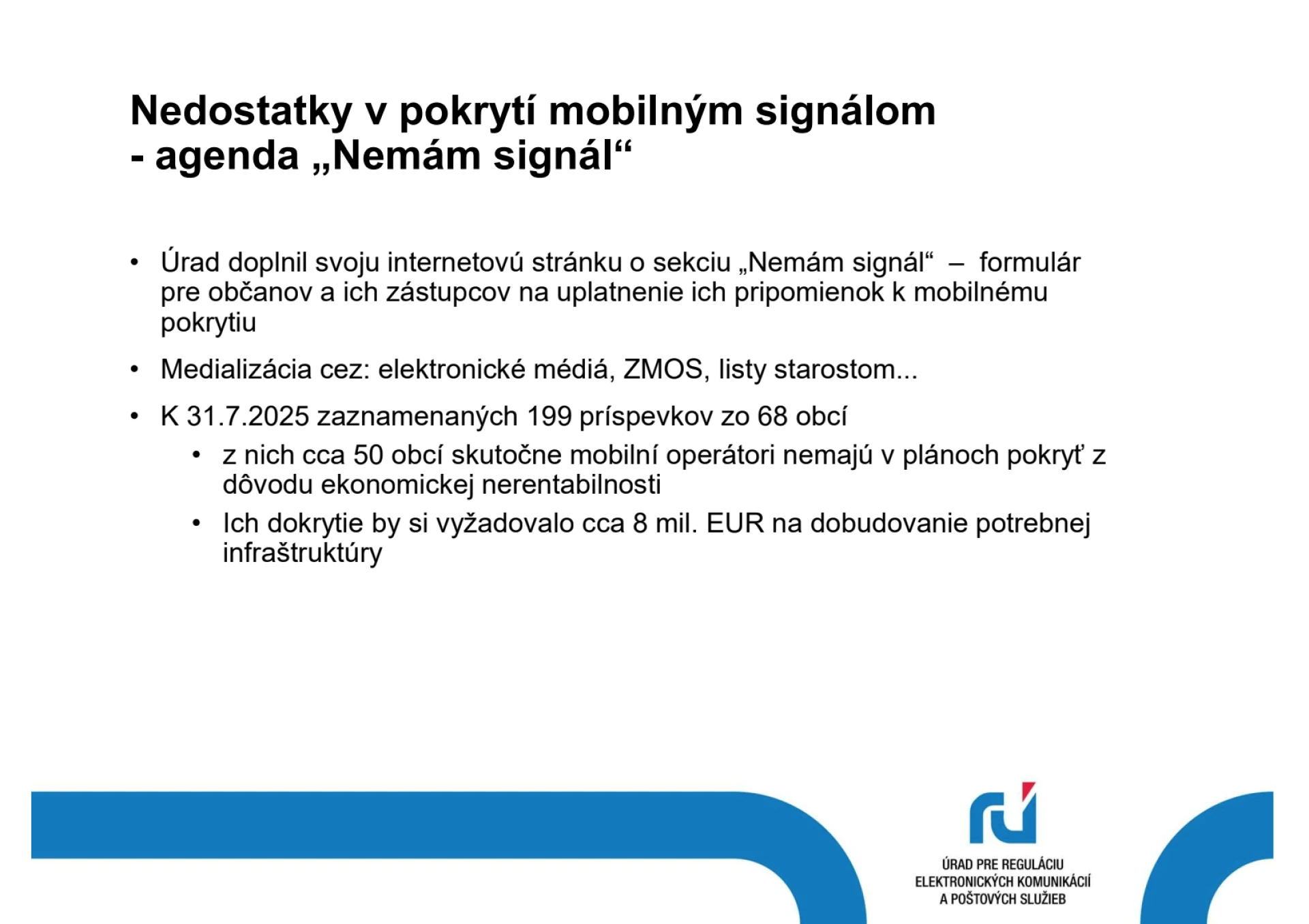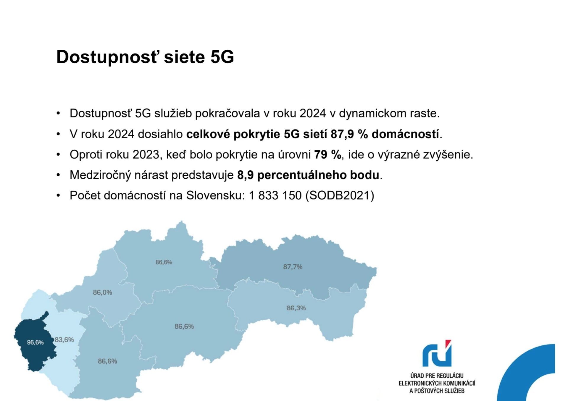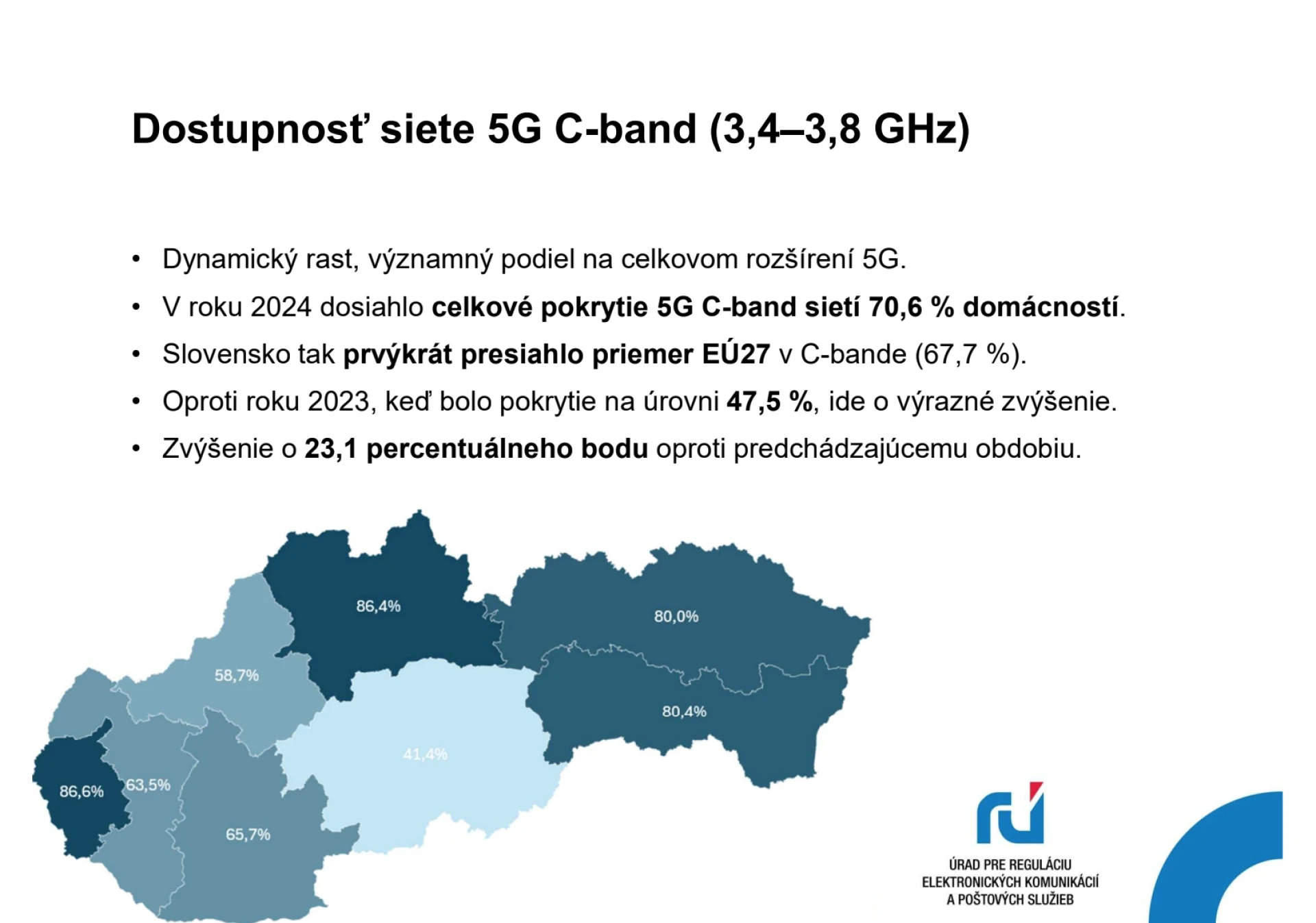 Medzinárodné porovnania Európskej komisie (DESI) potvrdzujú, že Slovensko patrí v oblasti „skutočného 5G“ medzi európsku špičku a výrazne prekonáva priemer EÚ. Tento úspech je o to cennejší, že operátori ho dosahujú napriek vysokej ekonomickej náročnosti budovania sietí v tomto pásme. Ich investície smerujú čoraz viac do vidieckych oblastí, kde často absentuje kvalitná fixná infraštruktúra. Túto finančne náročnú expanziu navyše realizujú primárne z vlastných zdrojov. Výsledkom je, že v pokrývaní riedko osídlených oblastí kvalitnou 5G sieťou patrí Slovensku siedme najlepšie miesto v celej Európskej únii.
