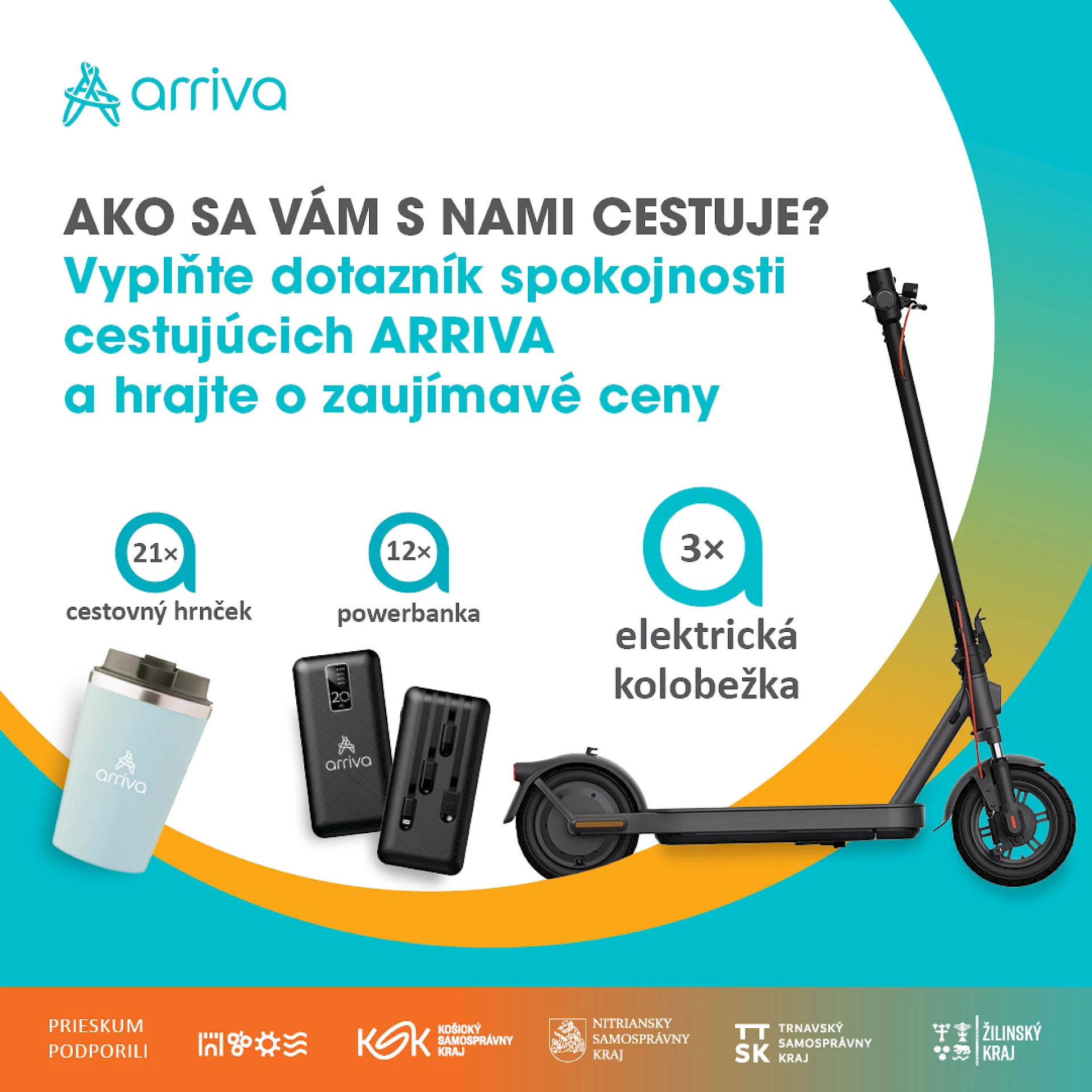 Každý účastník, ktorý vyplní dotazník, je automaticky zaradený do žrebovania o atraktívne ceny. Už po prvom mesiaci spoločnosť ARRIVA odmenila prvých 12 účastníkov ankety elektrickou kolobežkou, powerbankami pre dobíjanie mobilných zariadení, či praktickými cestovnými termohrnčekmi.