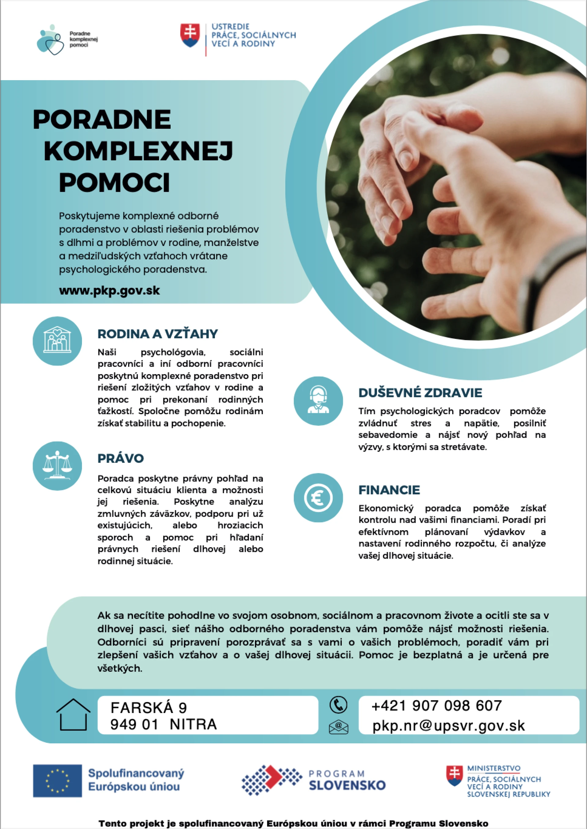 Ak poznáte niekoho, kto zápasí s problémami a nevie si rady, povedzte mu o Poradni komplexnej pomoci. Jedna veta alebo odporúčanie môže niekomu zmeniť život.