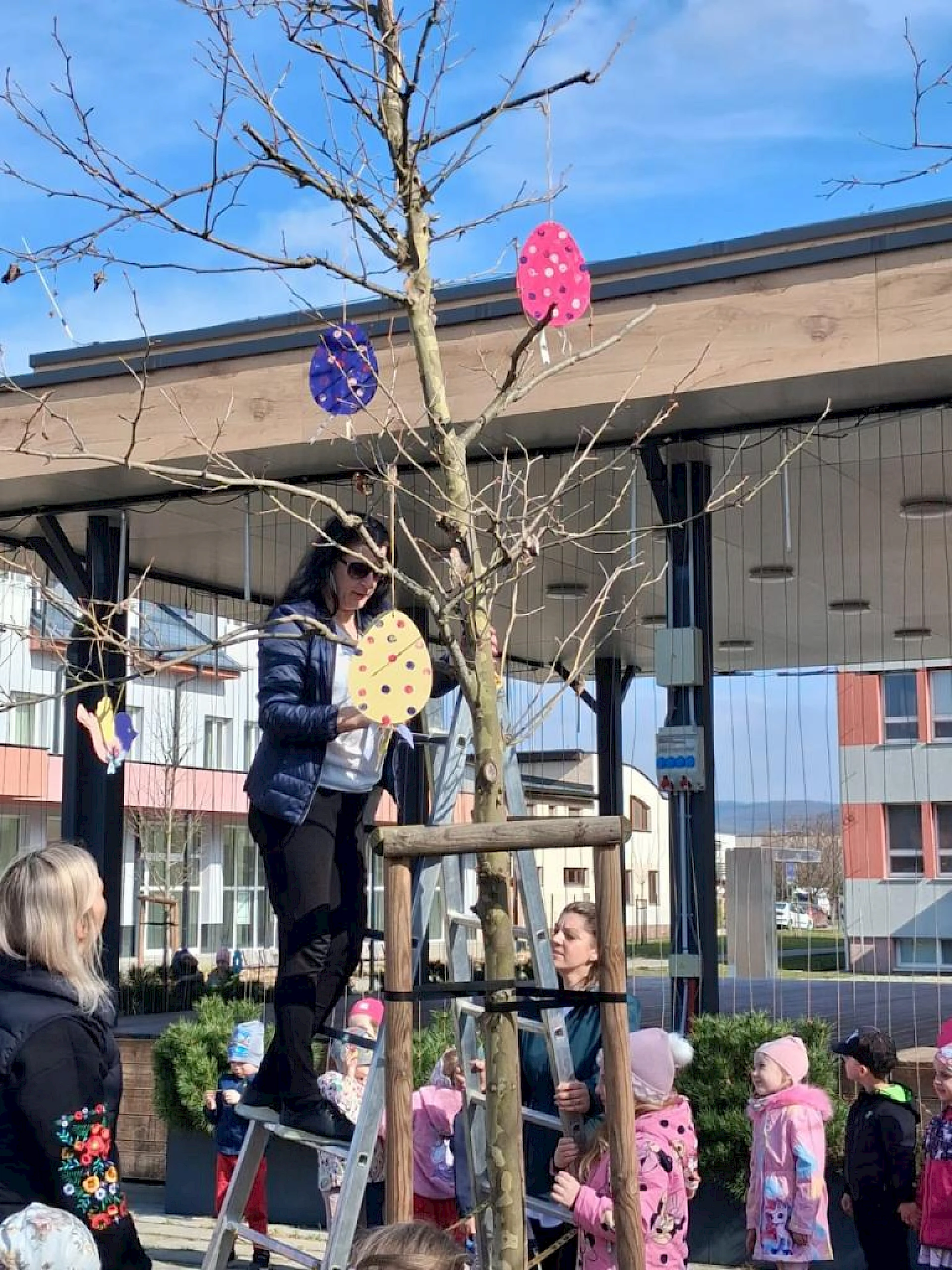Stromovú alej za pódiom na námestí veľmi efektne ozdobil kolektív učiteliek a detí z Materskej školy Beluša, pričom každá trieda priložila ruku k dielu a halúzky stromov zdobia pestrofarebné vajíčka, vtáčiky a kvietky z odolného materiálu. Zeleň okolo pódia doplnili deti s učiteľkami zapichovacími ozdobami s jarnou tematikou. Jednoduchý nápad sa tak vďaka kreativite premenil na originálnu výzdobu.