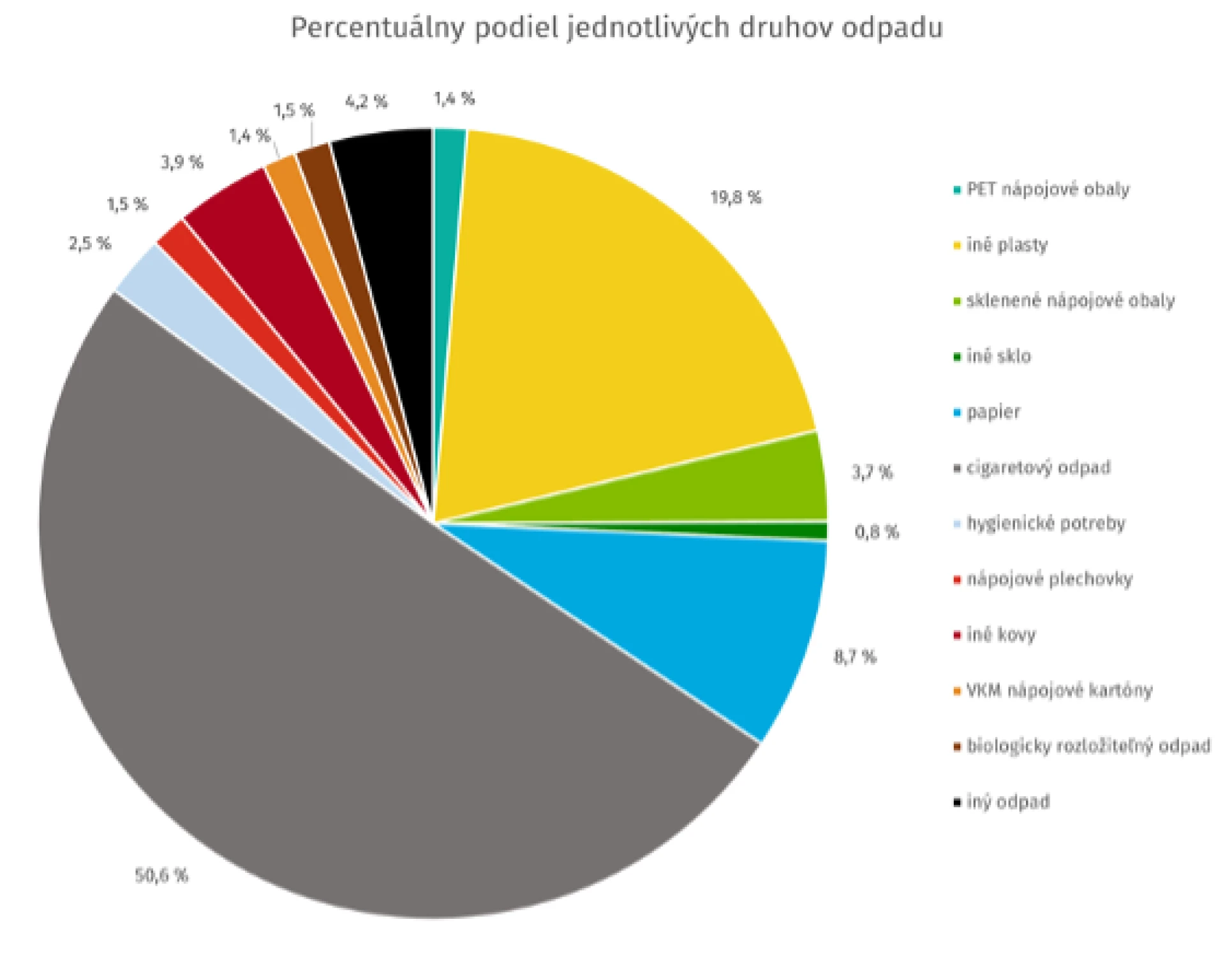 Z výsledkov analýzy spoločnosti vyplynulo, že na západnom Slovensku vrátane Bratislavy sa v najväčšej miere nachádza cigaretový odpad (50,8 %). Druhá priečka patrí iným plastom mimo nápojových PET fliaš (18,8 %), nasleduje papier (9,5 %) a iné odpady (4,1 %), kde boli zaradené napríklad textil, obuv, pneumatiky a podobne. Ostatné vyzbierané druhy odpadu majú 4 a menej percent.