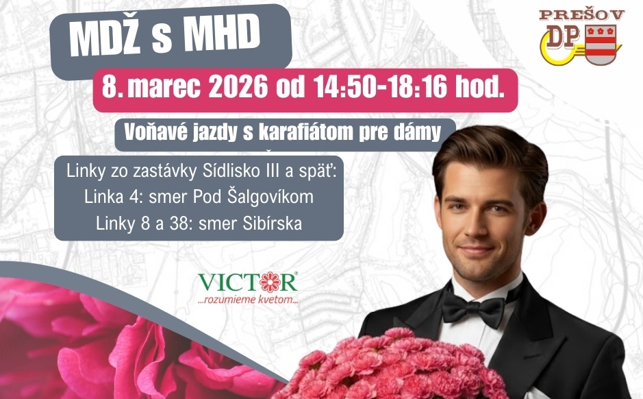 Dopravný podnik mesta Prešov (DPMP) pripravil pri príležitosti Medzinárodného dňa žien voňavé prekvapenie pre dámy. V nedeľu 8. marca 2026 môžu cestujúci na vybraných linkách MHD stretnúť džentlmena vo fraku, ktorý bude ženám rozdávať karafiáty.