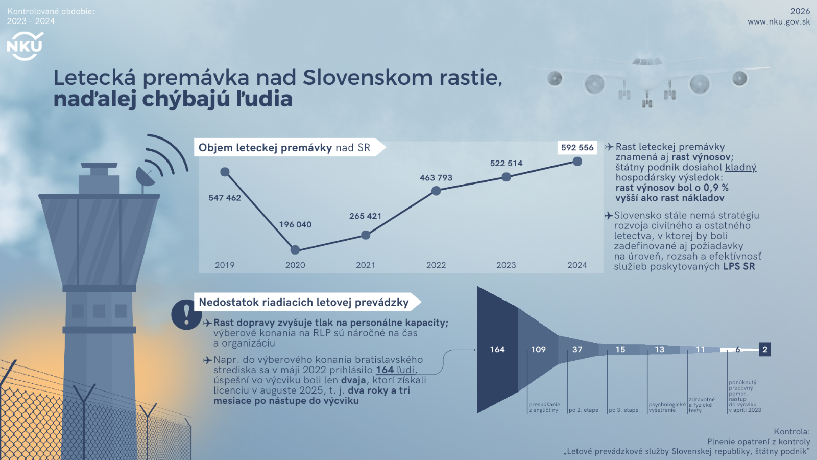 Najvyšší kontrolný úrad (NKÚ) SR prostredníctvom follow-up auditu preveril účinnosť opatrení, ktoré bol štátny podnik Letové prevádzkové služby (LPS) povinný prijať po prierezovej kontrole vykonanej v roku 2023.